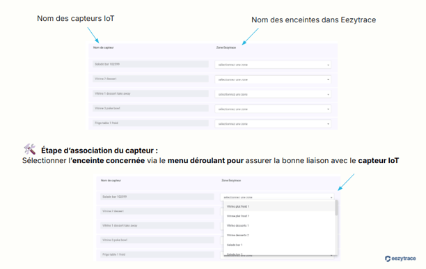 🎯 Objectif principal Associer vos capteurs IoT de température aux enceintes de stockage configurées dans Eezytrace. 👉 Cela permet la remontée automatique des relevés de température et leur centralisation dans l’outil.
