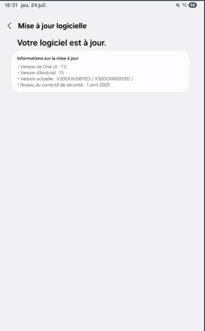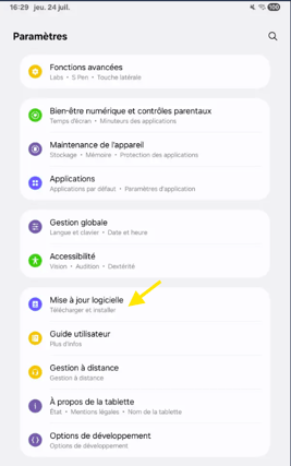 Si un message d'erreur bloque l’utilisation de la tablette, il est possible qu'une mise à jour logicielle de la tablette soit nécessaire. Voici les étapes pour accéder aux paramètres système et effectuer cette mise à jour.