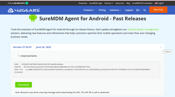 Pulsa en el primer enlace: «SureMDM Agent for Android / Past Releases».